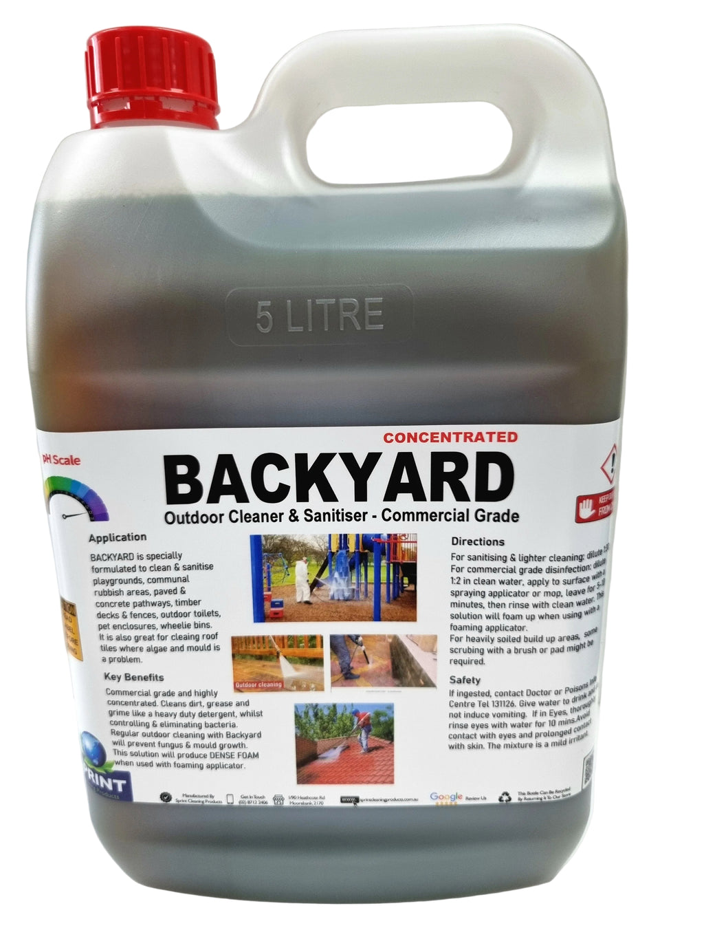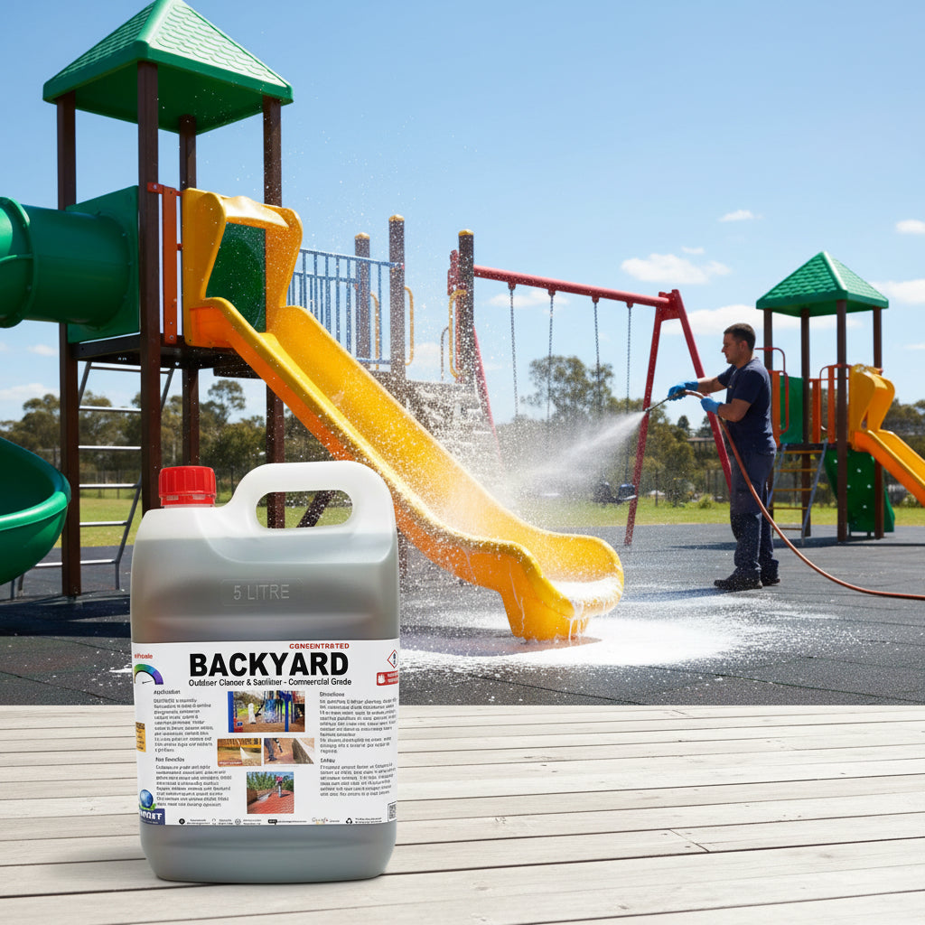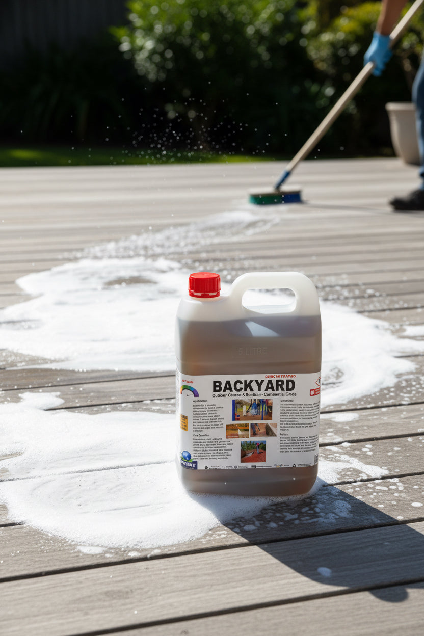 Backyard is a powerful solution for cleaning, degreasing, mould & algae removing, and disinfecting outdoor surfaces. Ideal for public playgrounds, concrete and paver pathways, timber decks & fences, wheelie bins, communal rubbish areas, outdoor toilets, pig pens, poultry houses, horse stables. With its specialised formula, this cleaner and sanitiser will keep your outdoor areas looking and smelling fresh.